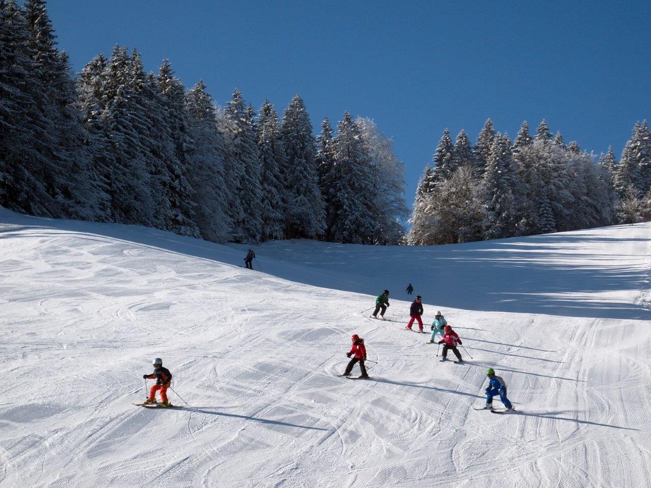 Auf der Familienabfahrt im Skigebiet am Kolben. Foto: AktivArena am Kolben GmbH & Co KGWer dennoch einfach mal ohne Nachwuchs losziehen und wahres Alaska-Feeling genießen möchte, meldet sich bei Husky-Workshops an, die vor der traumhaften Kulisse von Kloster Ettal stattfinden. Oder doch lieber auf Schneeschuhen oder Tourenskiern die Bergeinsamkeit erkunden? Dann sind die geführten Skitouren oder die „SportScheck Touren Tage“ ideal, um Schritt für Schritt zum Gipfelglück zu stapfen. Besonderes Highlight zum Zuschauen oder Mitmachen ist übrigens der alljährliche „König-Ludwig-Lauf“ am 6. und 7. Februar, der größte Volksskilanglauf Deutschlands.