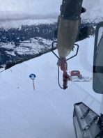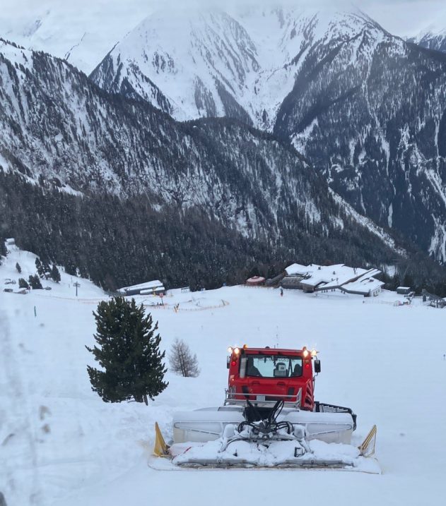 Schnee ist nicht gleich Schnee – das wird mir schnell klar, als ich neben Daniel „auf dem Bock“ Platz nehme – das ist echt eine Wissenschaft für sich. Die 500 PS dröhnen unter uns, wer schon einmal mit einem Helikopter mitgeflogen ist: Genauso fühlt es sich auch im Cockpit einer Pistenraupe an! Die Maschine zittert, wabert und faucht, als wir uns bergan bewegen. Weil die Jungs auf den sechs Pistenraupen in der Regel alleine unterwegs sind, schadet es nicht, wenn mal ein Gesprächspartner mit dabei ist. Also ist die Diskussion schnell im regen Gange – natürlich geht es in den allermeisten Fällen um die große Kunst des Schneemachens und des Schneeverteilens :-). Ich lerne schnell dazu: Schattenflächen sind eher leicht zu präparieren, doch sonnige Südwesthänge haben es in sich: Dabei geht es nicht nur um ein möglichst ebenes Pistenbild, sondern auch um den richtigen Zeitpunkt – und der ist je nach Höhenlage anders. Also sind die 6 Pistenraupen, die täglich im Einsatz sind, auf den 40 Pistenkilometern des Skigebiets Hochzeiger im Pitztal sehr flexibel unterwegs, aber GPS-gestützt und mit vielen Infos über den Schnee unter der Raupe: Auf 10 Zentimeter genau zeigt ein Display im Cockpit Daniel, wo er Schnee hinschieben und wo er Schnee abfräsen darf. Der Schneezauber fängt übrigens schon im November anfängt, wenn der erste Schnee fällt und die Herren Kollegen von der Beschneiung für ein tragfähiges Schnee-Fundament sorgen. Das ist auch die eher gefährliche Zeit für Pistenraupen: Man darf eher nicht planieren, verdichtet nur mit der Kette, damit die Luft aus dem Schnee austreten kann. Der größte Horror: Schwimmschnee, der nicht bindet – und auf dem man schon einmal ins Rutschen geraten kann.