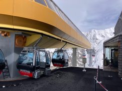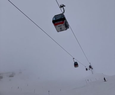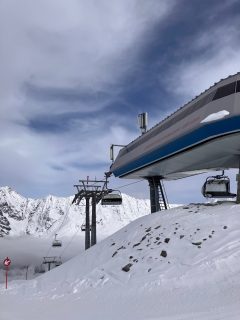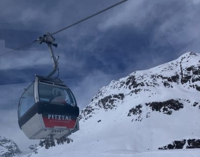 Wir starten pünktlich an der Gondel, fahren mit dem Skibus (der früh und abends in wirklich gutem, dichten Takt fährt) bis direkt vors Drehkreuz und schweben mit der Umlaufbahn komfortabel und ohne jede Wartezeit gen Rifflsee. Es ist beginnendes Ende der Hochsaison, aber Schlechtwetter – da wartest Du im Pitztal vergeblich auf lange Warteschlangen!