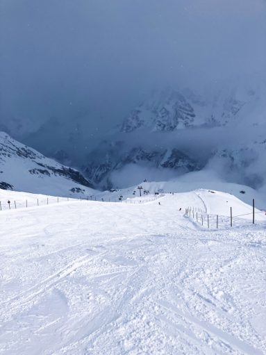 Oben erwartet uns – neben einem herausfordernden Mix aus Hochnebel und Schneeschauern – ein zwar einigermaßen überschaubares, aber echt positiv herausforderndes Skigebiet mit Schwierigkeitsstufen für alle Ansprüche. Wer erst ein paar Mal auf den Skiern steht, der ist direkt an der Bergstation der Rifflseebahn gut aufgehoben. Entlang des „Hirschtal“-Tellerlifts sind die ersten einfachen Schwünge möglich – und wer das einige Male ausprobiert hat, der macht weiter und fährt hinab zur Sunna Alp Bahn, einer Sechser-Sesselbahn, die einen wahren Blumenstrauß an Pisten erschließt: Die rote „6“, die blaue „7“ und die schwarze „5“. Da kann man schon einmal einen ganzen Vormittag verbringen, zumal bei eher widriger Witterung oder zum Einfahren.