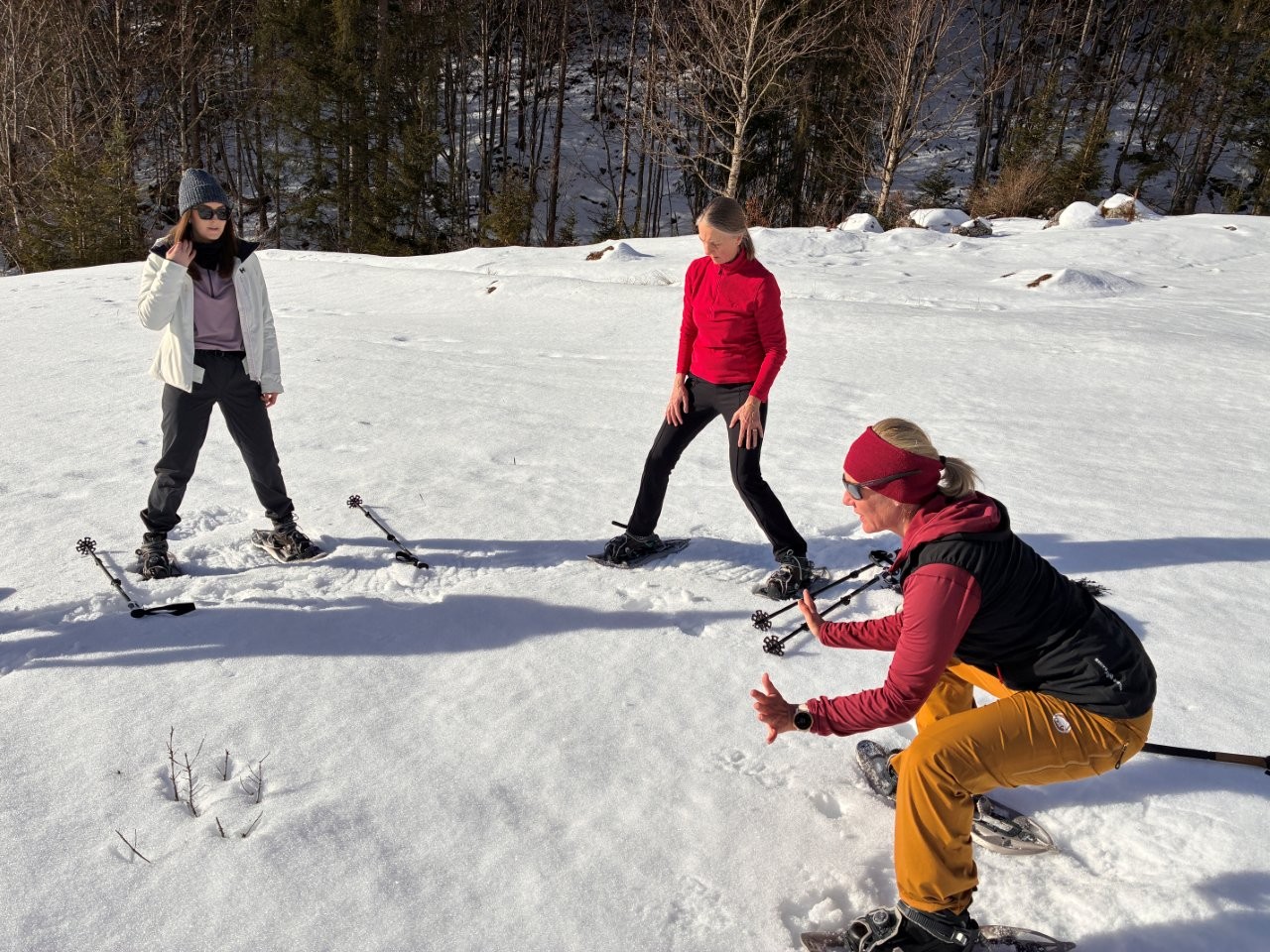 Wir fahren ein paar Minuten mit dem Büsle und absolvieren die ersten Höhenmeter schon mal bequem. Am Startpunkt haben der Schatten und wohltuende Frische die Frühlingssonne abgelöst, ein merklicher Temperaturunterschied! Sabrina erklärt den Newbies den Ablauf der Tour und die Technik der Schneeschuhe. Dann geht es los: die ersten Schritte auf dem frischen Schnee, das leise Knirschen unter den Schuhen, die klare Luft, die sich tief in die Lungen zieht. Alles wirkt sofort entschleunigend.