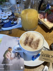 Einige echt geniale Abfahrten später starten auch die Nachbarlifte in den regulären Tagesbetrieb und wir haben knapp zwei Stunden nach unserem Start an der Talstation der Streubödenbahn eigentlich gar keine Lust, mit dem Pistengenuss aufzuhören. Was sich aber spätestens ändert, als wir in der Pulvermacher Almhütte nahe der TirolS-Verbindungsbahn zwischen den Skigebieten in Fieberbrunn und Saalbach das im Preis inkludierte Leckereien-Frühstück samt Sekt, Kaffeespezialitäten, Weißwurst, Bergkäse, Omelette, Forelle und allem, was man sich zum Frühstück wünscht, sehen. Also wird aus der eigentlich geplanten Kurzpause dann doch ein längerer Aufenthalt mit viel Genuss. 🙂
